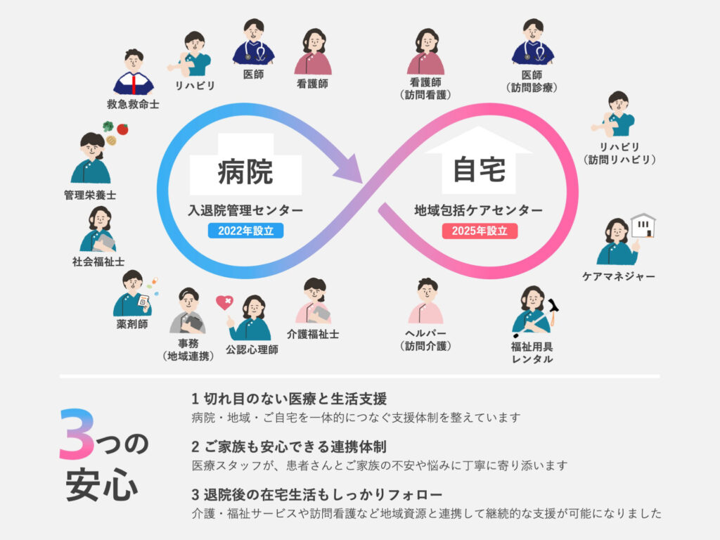 各専門職(看護師、介護士、リハビリ専門職、ケアマネジャー、福祉用具専門相談員など)が一つの部署として緊密に連携し、包括的なケアを提供します。多様なニーズにも柔軟に対応します。例えば、訪問介護員(ヘルパー)が利用者の状態変化に気づいた場合、すぐに看護師やケアマネジャーに連絡し、適切な対応を行います。入院患者さんにおいては病院内の「入退院管理センター」とも連携し、退院の当日から切れ目のない在宅サービスを提供します。