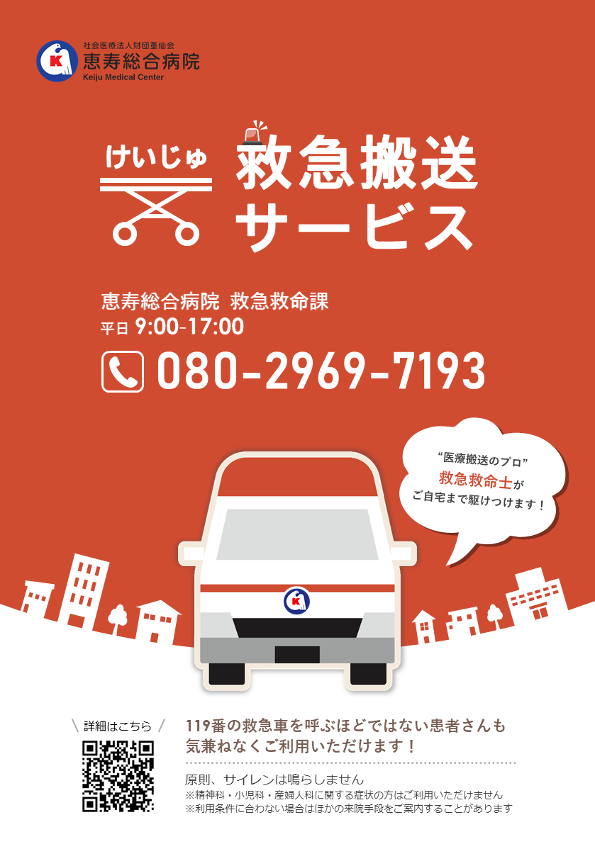 けいじゅ救急搬送サービスは、つらい症状があるが、消防救急車(119番)を利用するほどではない患者さんも気兼ねなくご利用いただけます。院内スタッフと連携をとりながら迅速に対応いたしますので安心してお任せください。
